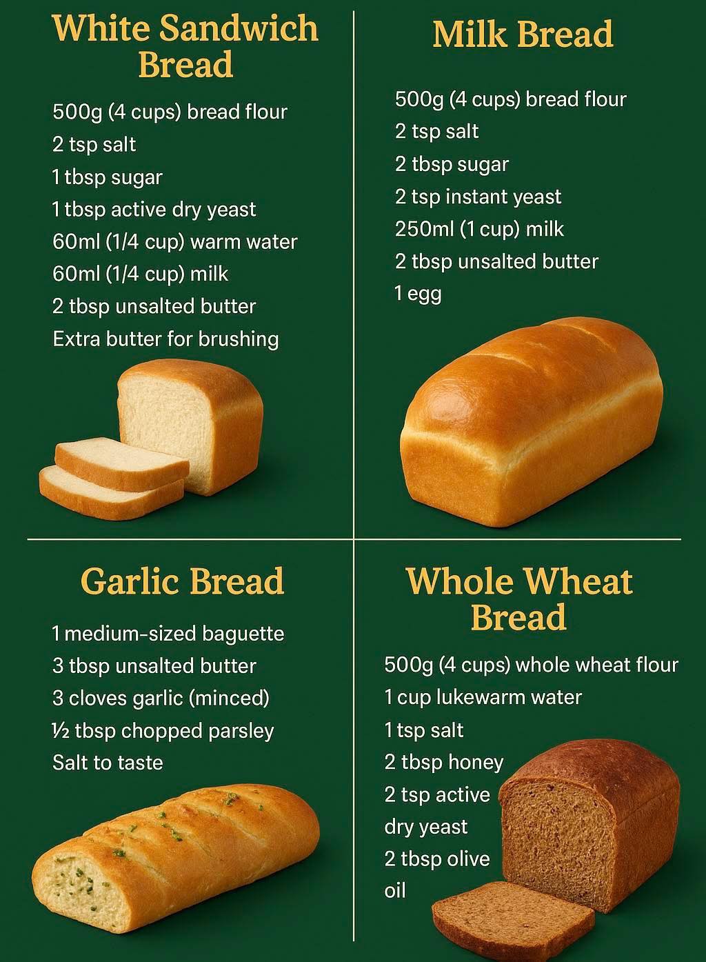 From fluffy sandwich loaves to fragrant garlic bread, these four easy homemade bread recipes cover all your cravings. Whether you’re baking for breakfast, dinner, or a cozy snack, each recipe is a guaranteed winner with simple ingredients and comforting results. Let’s get baking!