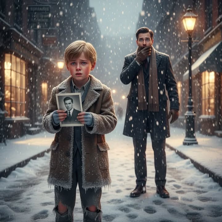 He picked it up, brushing off the snow, and glanced around. The street was busy, people rushing past, none noticing him. He opened the wallet carefully. His heart skipped a beat—not at the cash, which was plentiful, but at a photograph tucked in a hidden flap. The photo showed a small boy with strikingly familiar blue eyes, messy brown hair, and a shy smile. Jason froze. Those eyes… that smile… it was like looking in a mirror.