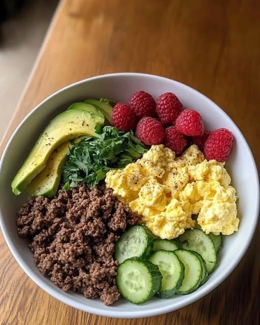 This Beef & Egg Power Bowl with Avocado, Raspberries, and Cucumber is the perfect high-protein, low-carb meal that’s packed with fresh flavors. With savory ground beef, scrambled eggs, and vibrant toppings, it’s an energizing and delicious option for any meal of the day. Bonus: it’s diabetic-friendly and takes just 15 minutes to make!