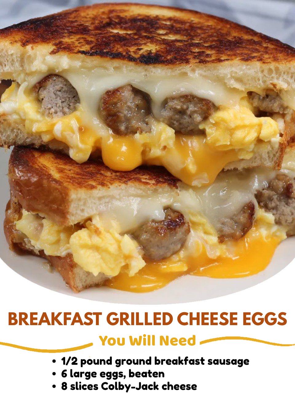 This Breakfast Grilled Cheese Eggs sandwich takes morning comfort food to the next level — combining savory sausage, fluffy scrambled eggs, and melted Colby-Jack cheese between crisp, buttery slices of sourdough. Each bite is golden, gooey, and perfectly balanced, making it a satisfying start to any day.
