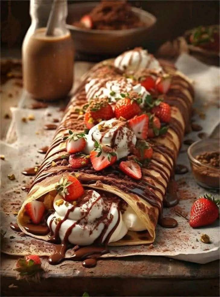 Elegant, light, and decadently creamy — this Chocolate Strawberry Cream Crepe Roll is the ultimate dessert showstopper! Soft cocoa crepes are layered with whipped cream and juicy strawberries, then rolled into a beautiful log and finished with chocolate drizzle, cocoa dust, and pistachio crunch. Perfect for celebrations or a sweet indulgence any time. 🍰 Ingredients … Lire plus
