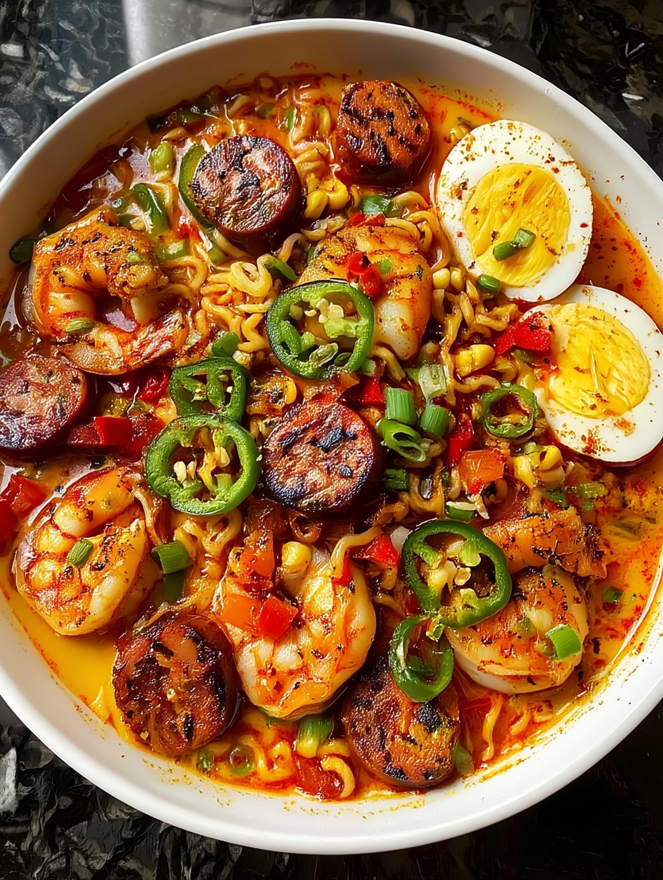 Creamy Jalapeño Cheddar Sausage & Shrimp Ramen Bowl