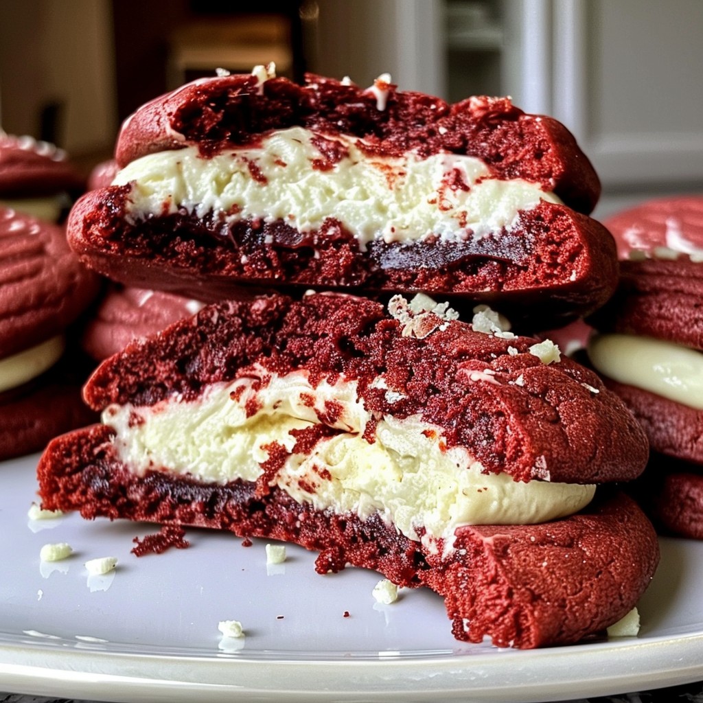 These cheesecake-stuffed red velvet cookies bring together the moist, cocoa-kissed richness of classic red velvet dough with a hidden center of smooth, velvety cheesecake. Each cookie bakes up with lightly crisp edges, a soft interior, and a creamy surprise in the middle. The contrast of textures and the vibrant color make them perfect for celebrations, gifting, or simply treating yourself. Preparing the filling ahead and freezing it ensures the cheesecake center stays intact while the cookie dough bakes to its ideal tenderness.