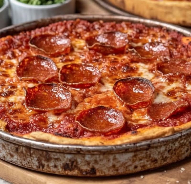 A thick, cheesy, and savory pizza with a buttery crust and loaded with rich tomato sauce and toppings—truly iconic!