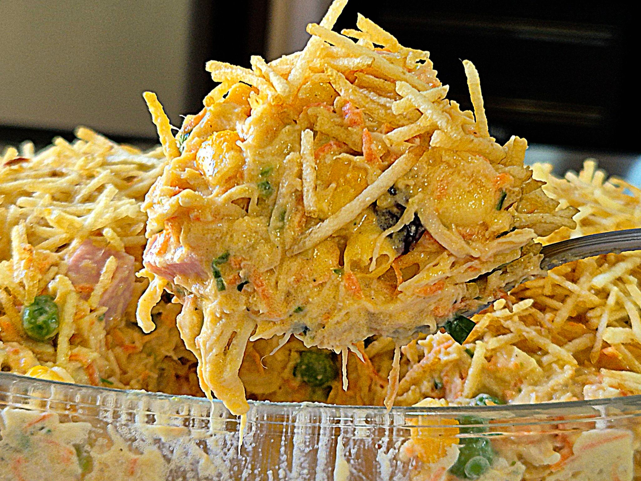This creamy chicken salad is a hearty and flavorful dish that combines tender shredded chicken, fresh vegetables, savory ham, and cheese, all coated in a rich and creamy dressing. Perfect for a light lunch, picnic, or as a side dish at a family gathering, this salad offers a delightful balance of textures and flavors. The combination of chicken, peas, carrots, and mozzarella is further enhanced by a tangy mayonnaise and cream dressing, with a touch of olive oil and seasonings for extra depth.