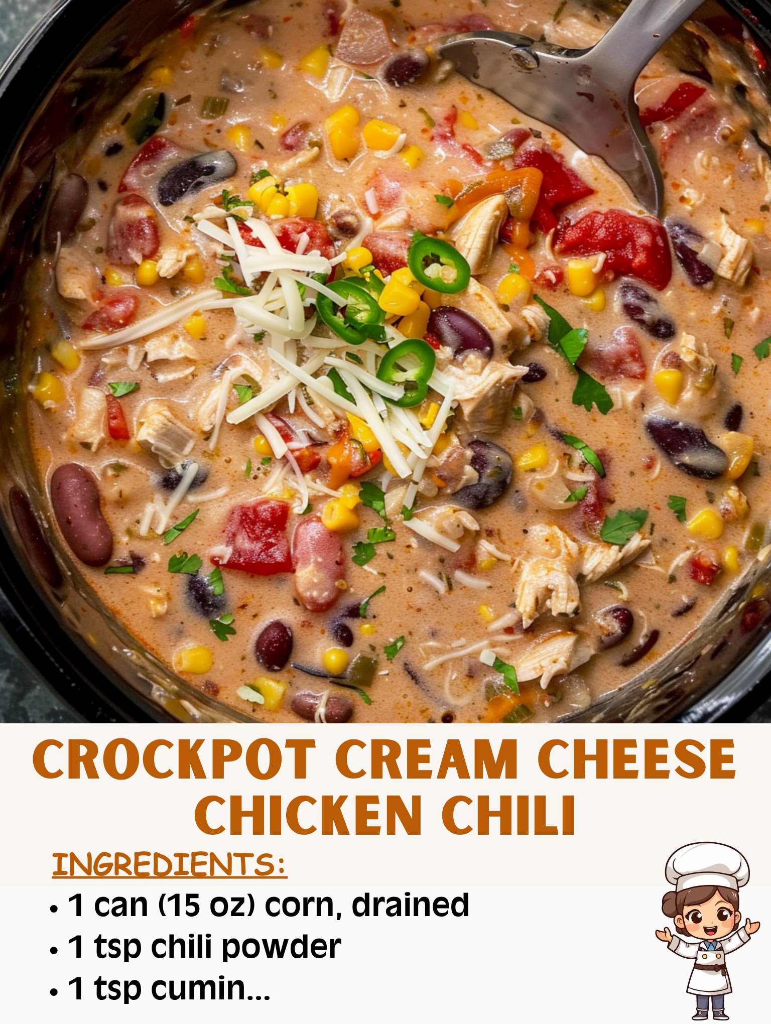 🍲 Creamy, hearty, and oh-so comforting — this Crockpot Cream Cheese Chicken Chili is a cozy bowl of goodness that’s perfect for busy weeknights or chilly evenings. Tender shredded chicken, black beans, corn, and diced tomatoes simmer together in a creamy, flavorful broth seasoned with ranch and spices. It’s an easy, one-pot meal that’s guaranteed to warm you from the inside out! 🌶️