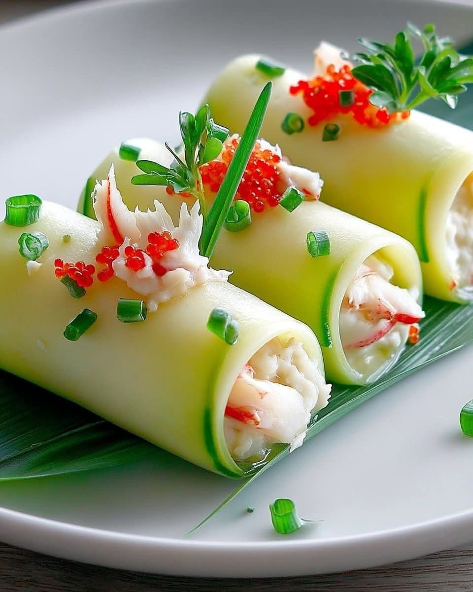 This light, refreshing, and visually elegant appetizer is perfect for warm weather entertaining or as a sophisticated starter. Thin ribbons of crisp cucumber are rolled around a flavorful crab and chive filling, then topped with herbs and edible petals for a gourmet presentation. Simple to assemble, but sure to impress!