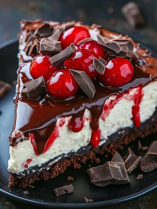 This Decadent Black Forest Cheesecake Delight is the perfect indulgence for any special occasion or dessert craving. Combining rich cream cheese, smooth whipped cream, tart cherries, and deep chocolate flavors, this no-bake cheesecake captures the essence of the classic Black Forest cake in a creamy, luxurious form. The crushed chocolate cookie crust adds a perfect crunchy base, while the layers of creamy cheesecake filling and fresh cherries create a harmonious balance of sweetness and tartness. Topped with dark chocolate shavings, this dessert is sure to impress your guests and satisfy your sweet tooth.