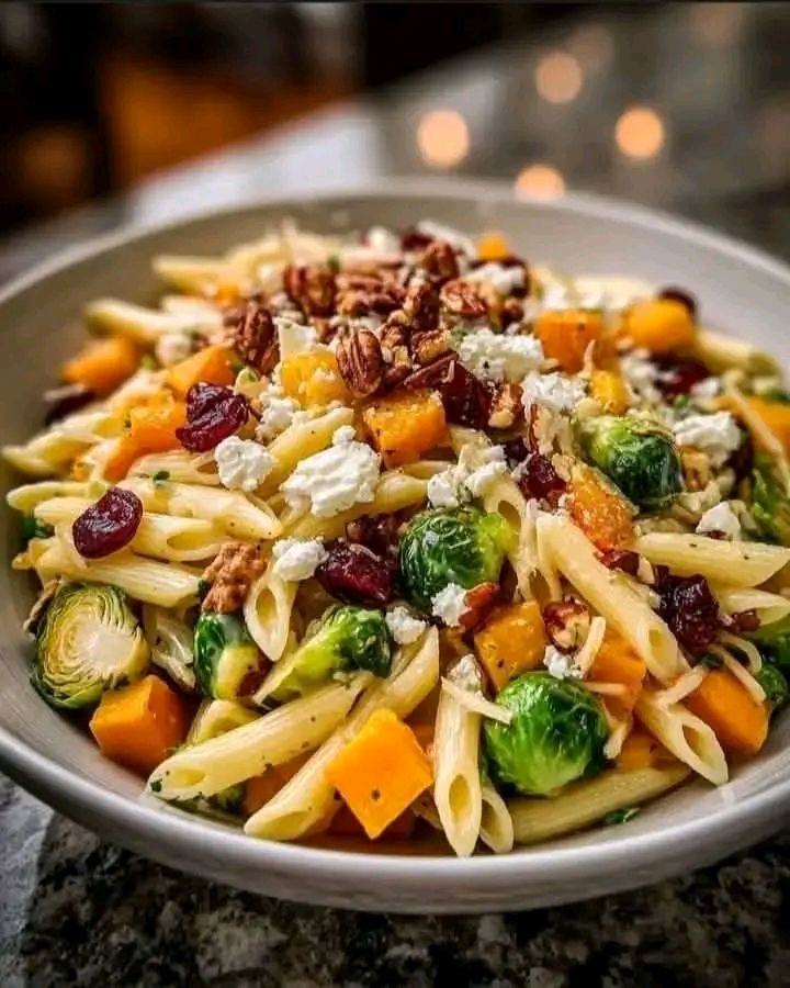 This Fall Harvest Pasta Salad is a vibrant, flavorful dish that celebrates the best of autumn produce. With roasted butternut squash, caramelized Brussels sprouts, crisp apples, tart cranberries, toasted nuts, and creamy cheese—all tossed with a maple Dijon vinaigrette—it’s the perfect blend of sweet, savory, and seasonal. Serve it warm or chilled for a satisfying side or a light vegetarian main course!
