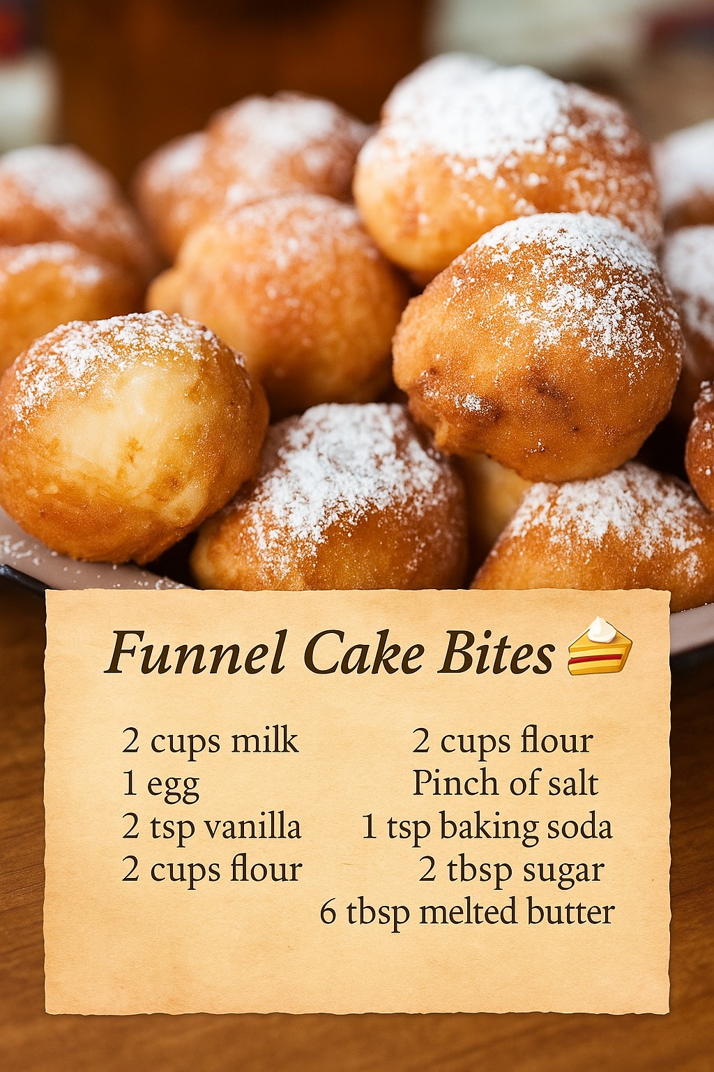 Funnel Cake Bites bring all the nostalgic magic of the fair into your kitchen—crispy on the outside, soft on the inside, and finished with a snowy dusting of powdered sugar. These bite-sized golden treats are made from a simple, rich batter and fried to perfection for an easy, shareable dessert that’ll make you say OMG 😱 with every bite!