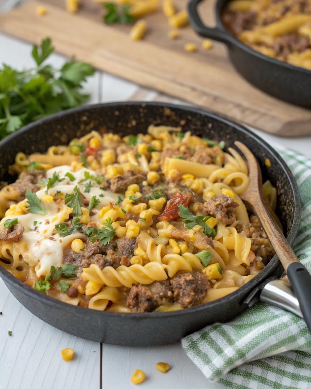 This hearty, creamy beef skillet is loaded with comforting flavors: juicy ground beef, sweet corn, tangy ranch, and melty cheddar cheese all come together with tender pasta for the ultimate one-pan meal. Ready in just 25 minutes, it’s a guaranteed crowd-pleaser perfect for busy weeknights or cozy weekends.