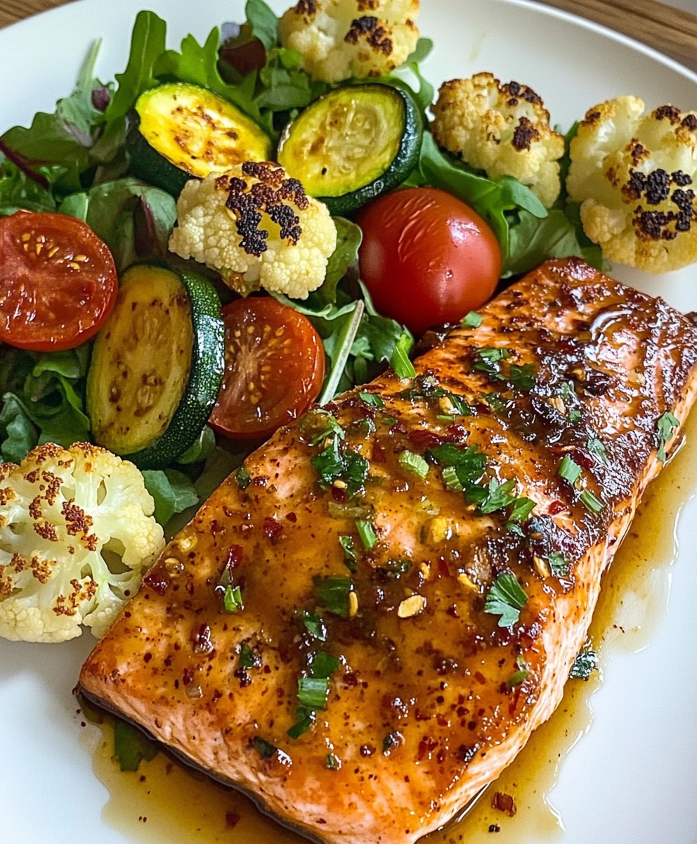 This colorful, balanced plate features tender salmon glazed with sweet heat, golden-roasted cauliflower, pan-seared zucchini, and a crisp garden salad. Fresh, vibrant, and loaded with nutrients, it’s a wholesome dinner that feels like a restaurant dish—ready in just 30 minutes.