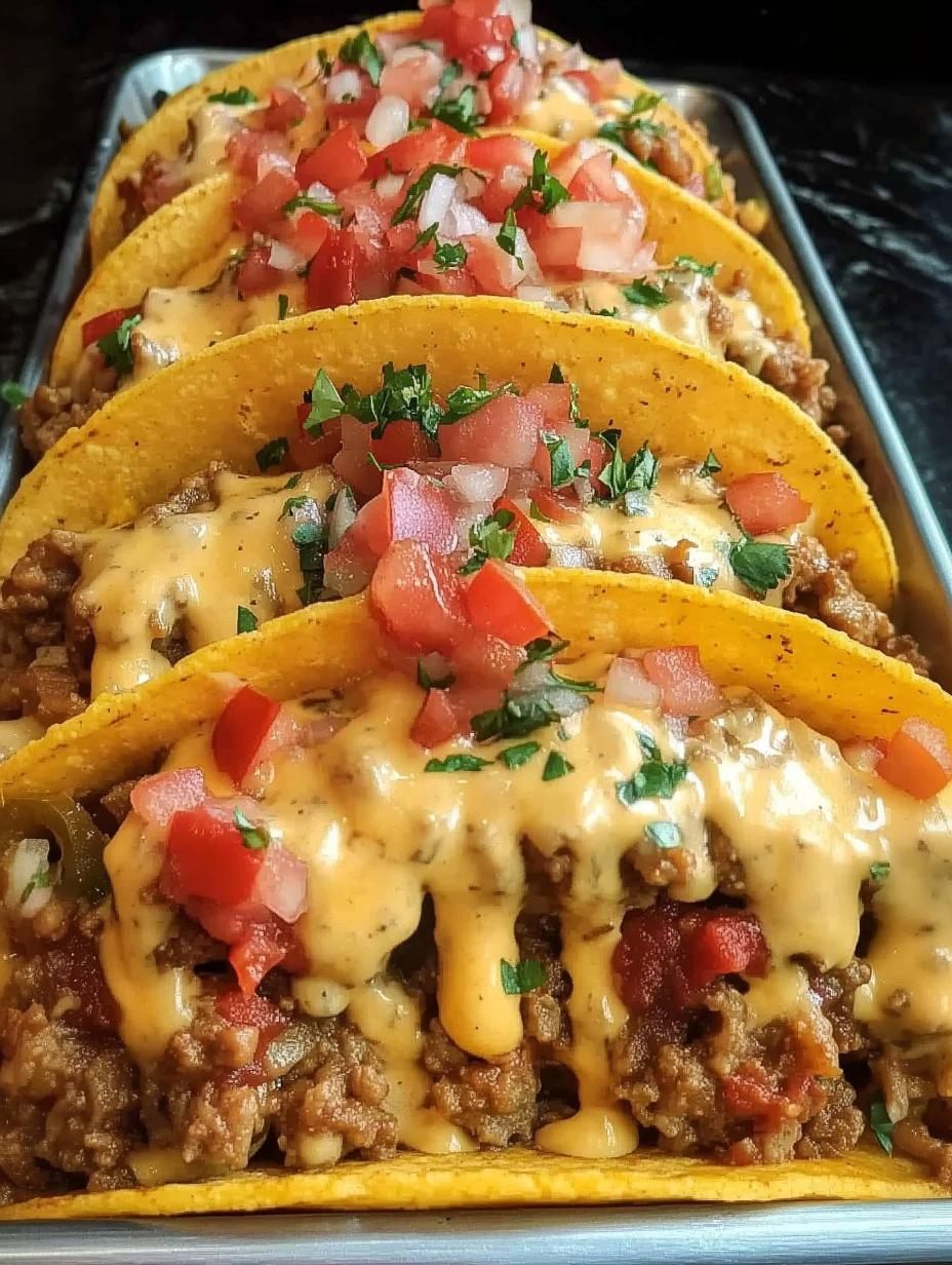 A delicious and hearty dish that combines seasoned ground beef with a rich, creamy cheese sauce, all nestled in crispy taco shells. Perfect for taco night or any casual gathering!