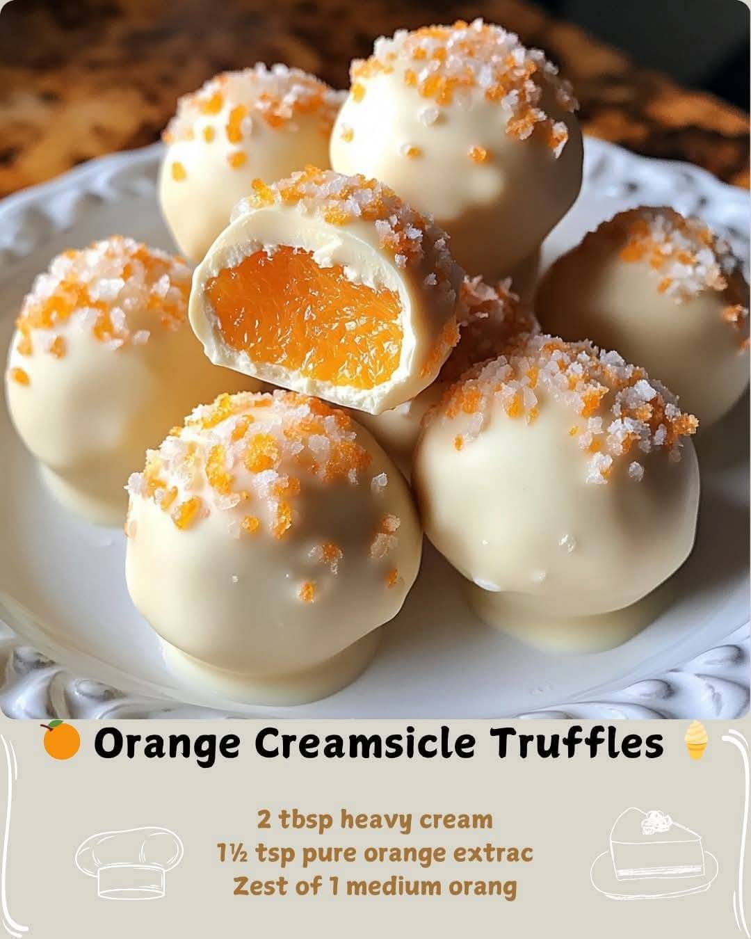These Orange Creamsicle Truffles blend creamy white chocolate, bright citrus extract, and real orange zest for a nostalgic, sunny flavor wrapped in a silky chocolate shell. The combination of dry pudding mix and powdered sugar creates a smooth, no-bake truffle center that firms beautifully once chilled. Every bite is soft, fragrant, and reminiscent of a classic creamsicle—perfect for gifting, holiday platters, or keeping in the freezer for a quick sweet treat. Optional decorative coatings add texture, shimmer, or tropical flair, making these truffles as stunning as they are delicious.