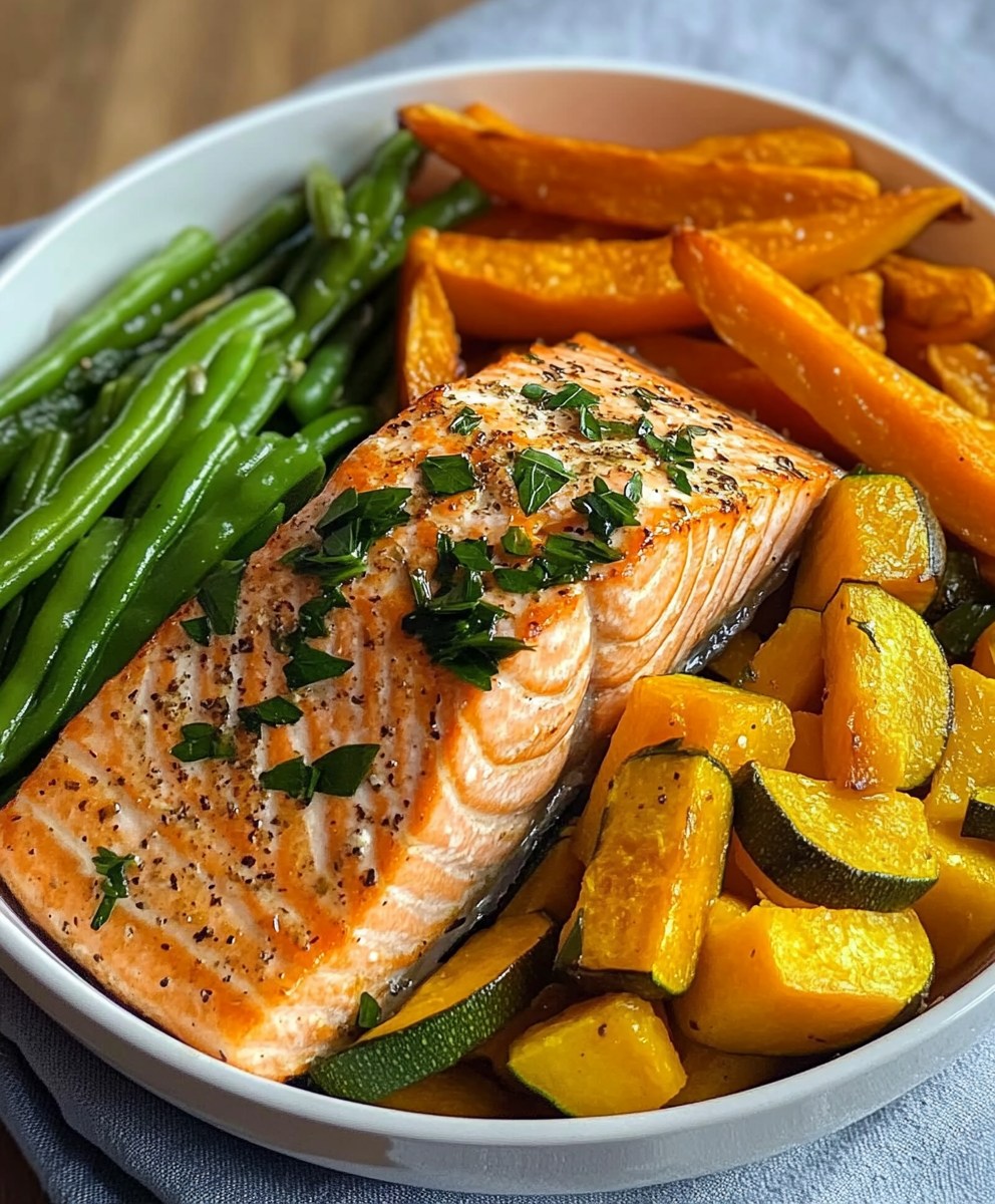 This vibrant, wholesome meal features tender oven-baked salmon seasoned with herbs, paired with crispy roasted butternut squash and sweet potato fries, and sautéed green beans, zucchini, and carrots. Nutritious, satisfying, and bursting with flavor, this dish is the perfect balance of healthy ingredients in every bite!