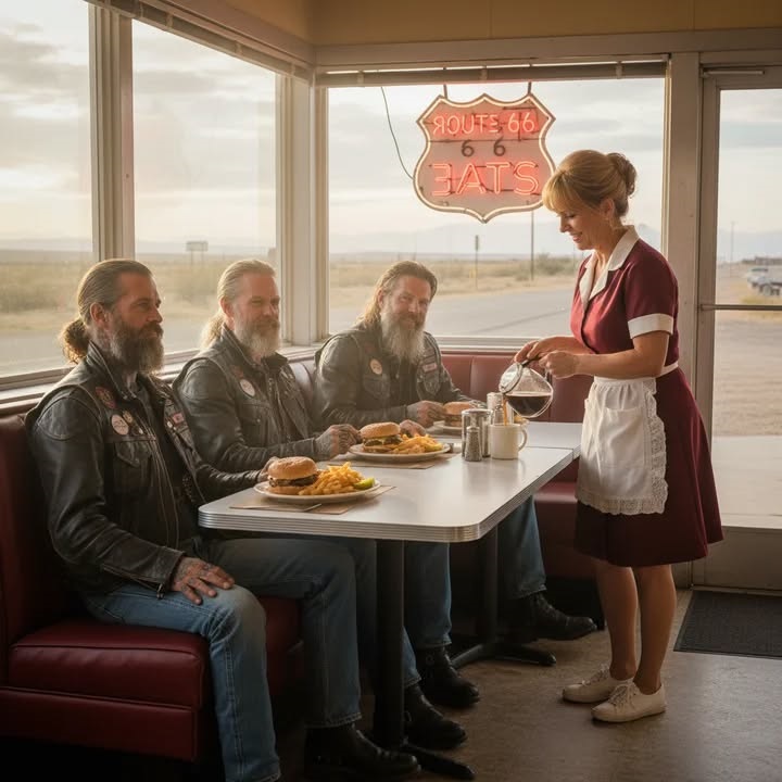 The bikers sat in a booth, their faces etched with grief and tattoos, and their silence was heavy. Sensing their sadness, Sarah brought them coffee and hamburgers, which led to a brief discussion about Jackson, their lost brother.