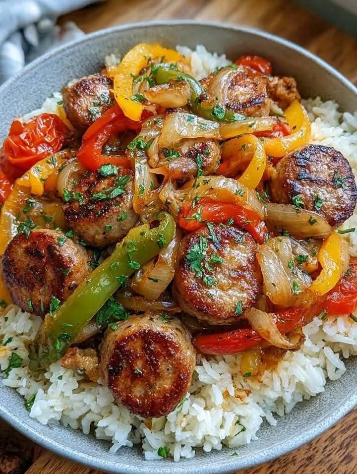 Sausage, Onion, Bell Peppers & Tomatoes Over Rice โ a quick, colorful, and hearty one-pan meal! Savory turkey sausage is paired with sweet bell peppers, caramelized onions, and juicy tomatoes for a satisfying dinner that comes together in just 30 minutes. ๐ด๐ถ๏ธ๐