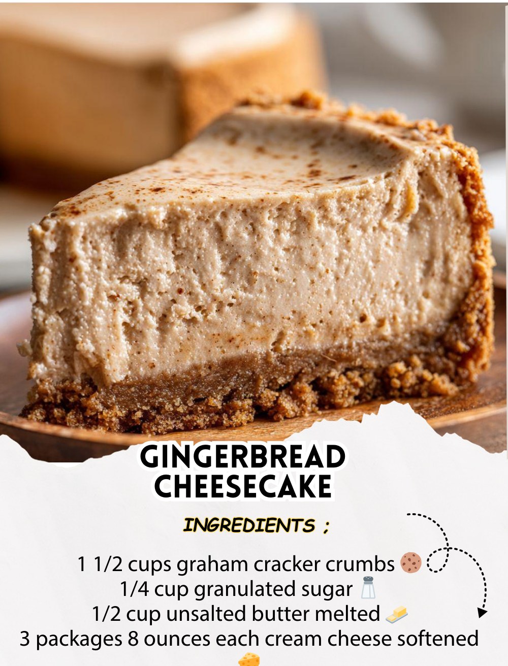 Gather these pantry staples and fresh picks for your gingerbread cheesecake—think buttery crumbs evoking fresh-baked cookies and a filling so smooth it melts on your tongue. This recipe serves 12, perfect for gatherings.
