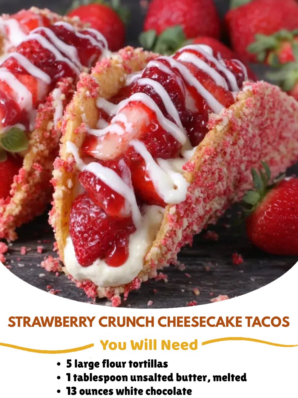 These Strawberry Crunch Cheesecake Tacos are a dreamy dessert mashup — crisp golden tortilla shells filled with rich, creamy cheesecake and coated in a nostalgic strawberry crunch inspired by classic ice cream bars. Finished with a drizzle of white chocolate and crushed cookies, they’re a show-stopping no-bake treat that’s as fun to make as it is to eat.