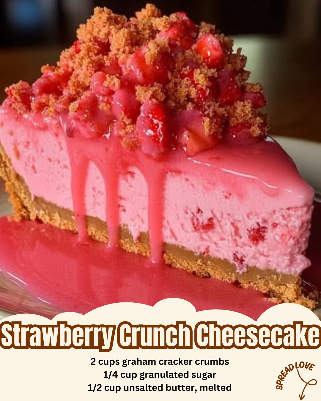 This Strawberry Crunch Cheesecake is a dreamy dessert that combines rich and creamy strawberry cheesecake, a buttery graham cracker crust, a sweet strawberry topping, and the nostalgic crunch of strawberry shortcake ice cream bars—all in one stunning slice. It’s the ultimate summer celebration cake or any-time indulgence for strawberry lovers!